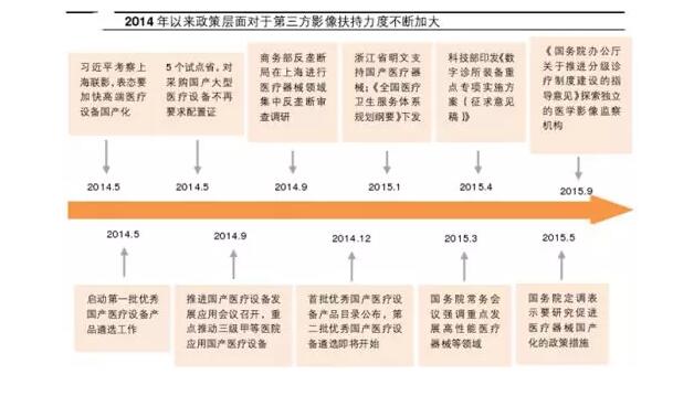 國內(nèi)的醫(yī)學(xué)影像中心復(fù)制了這種模式,但初期受限于人才引進難、資金籌集少、隱形歧視和政策限制等原因,彼時獨立醫(yī)學(xué)影像中心在國內(nèi)發(fā)展緩慢。2016年8月,衛(wèi)計委發(fā)布《醫(yī)學(xué)影像診斷中心基本標(biāo)準(zhǔn)和管理規(guī)范(試行)》,首次明確了第三方醫(yī)學(xué)影像診斷中心獨立法人地位,其后隨著“十三五”醫(yī)改規(guī)劃中“加快社會辦醫(yī)”的內(nèi)容推出和醫(yī)療改革的不斷推進,行業(yè)終于迎來轉(zhuǎn)機。
