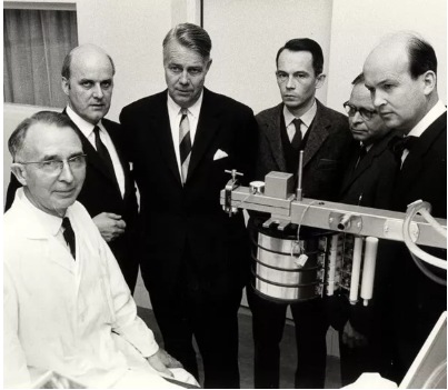 第一次血管通路手術發(fā)生在1948年,尼爾斯Nils Alwall(1904-1985)(左一)和萊納特?奧斯特格林(Lennart ?stergren)(左四),在瑞典名校隆德大學對轉鼓人工腎進行了改進,使其能通過負壓進行超濾。但由于各種并發(fā)癥,1949年被迫停止了該類手術。