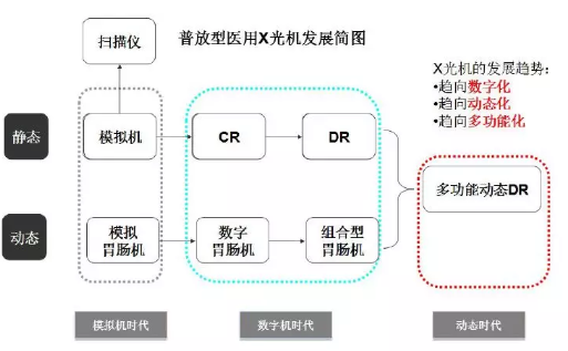 在靜態(tài)成像層面,X光機的發(fā)展經(jīng)歷了模擬機、CR、DR三個階段,成像速度越來越快,成像質量越來越高。