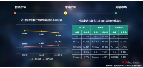 將品牌分為國產(chǎn)和進(jìn)口。具體來看,低端超聲市場中,其相對比例上,從2017年到2019年上半年,進(jìn)口品牌由7.5%增長為24.9%,而國產(chǎn)品牌則由92.5%降低為75.1%,這也說明進(jìn)口品牌采取了應(yīng)對基層市場的一定策略。