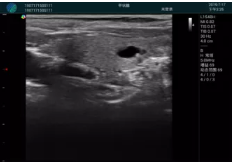 腺體內部清晰顯示一低回聲塊影,形態(tài)不規(guī)則,邊界模糊,邊緣呈毛刺狀,內部見砂礫樣鈣化