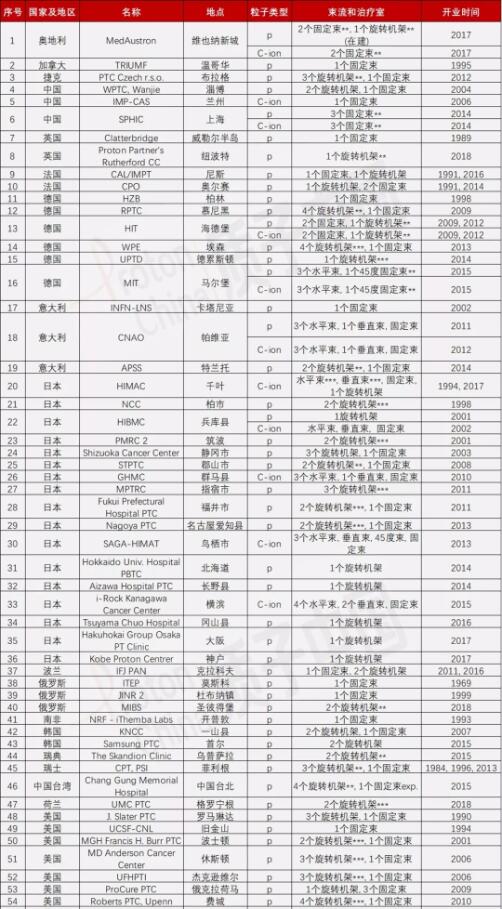 附:全球已運(yùn)營(yíng)質(zhì)子重離子治療中心匯總表(截至2018年7月)