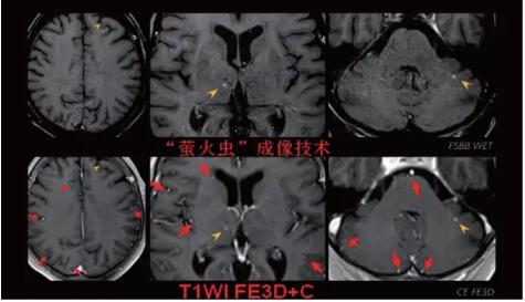 此技術(shù)主要用于神經(jīng)系統(tǒng)惡性腫瘤,以及其他腫瘤腦轉(zhuǎn)移瘤篩查。傳統(tǒng)情況下做腫瘤腦轉(zhuǎn)移篩查,很容易漏掉5mm以下小病灶,臨床發(fā)現(xiàn)后干預(yù)治療比較晚,要實現(xiàn)2mm高空間分辨率和超薄層全腦掃描在保證信噪比的情況下需要很長時間大概十多分鐘,而且薄層增強序列顱內(nèi)血管呈高亮信號,會干擾顱內(nèi)小病灶的觀察,血管和小病灶區(qū)分困難。佳能”螢火蟲”成像技術(shù)既可以實現(xiàn)高空間分辨率和超薄層(最薄可實現(xiàn)0.2mm)全腦掃描,掃描時間短,2-3分鐘即可實現(xiàn)全腦3D掃描,同時避免了血管高亮信號的干擾,對顱內(nèi)原發(fā)或繼發(fā)的微小腫瘤檢查有重大意義。“螢火蟲”成像技術(shù)具有磁敏感效應(yīng),對于亞急性血敏感敏感,可以區(qū)分出血和強化的腫瘤。