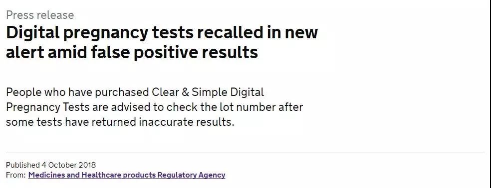 據(jù)BBC、《衛(wèi)報(bào)》、美國(guó)CNN等多家媒體報(bào)道,英國(guó)驗(yàn)孕棒品牌Clear&Simple的一批已售出的電子驗(yàn)孕棒中,至少有58000名英國(guó)顧客的驗(yàn)孕結(jié)果可能出現(xiàn)“假陽性”,而這其中的大部分的女性很有可能根本沒有懷孕。這一數(shù)字在隨后的英國(guó)《電訊報(bào)》的報(bào)道中增加至60000人。