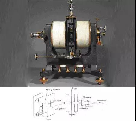 因為毛細管靜電計的毛細血管不可能做的太細,他無法測到更精確的電流,愛因托芬改進了這個裝置,他利用通電的導(dǎo)體可以產(chǎn)生磁場的安培右手定律發(fā)明了----磁電式儀表。愛因托芬把提高靈敏度的任務(wù)完全交給超大的電磁鐵,而動圈以匝數(shù)最少,質(zhì)量最輕為目標。最終的結(jié)果是1895年推出的弦線式電流計---看清楚還不是心電圖機。