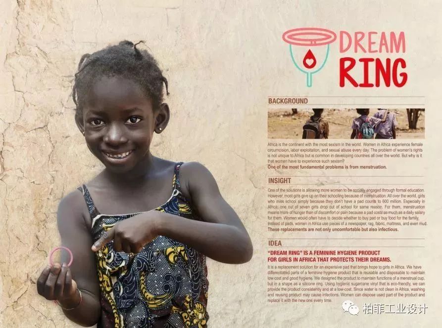 設(shè)計說明:非洲婦女每天都會經(jīng)歷性別偏見和歧視,而針對這個問題所提出的解決方案是讓更多的女性參與正規(guī)教育。無法取得便宜且衛(wèi)生的女性衛(wèi)生用品是許多非洲女孩放棄上學(xué)的主要原因之一。一片衛(wèi)生棉可能會花掉一天的工資,迫使婦女在經(jīng)期來時會使用報紙、破布、布料甚至泥土。DREAM RING是一款便宜又環(huán)保的女性衛(wèi)生用品,由矽膠環(huán)和甘蔗乙烯制成??芍貜?fù)使用的矽膠環(huán)和拋棄式的甘蔗乙烯是DREAM RING既經(jīng)濟又安全的關(guān)鍵因素。