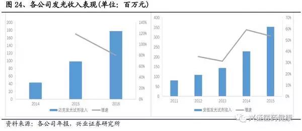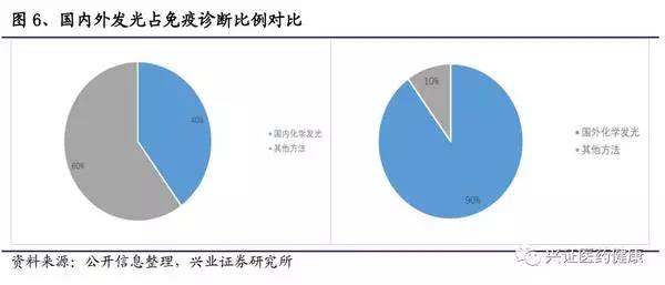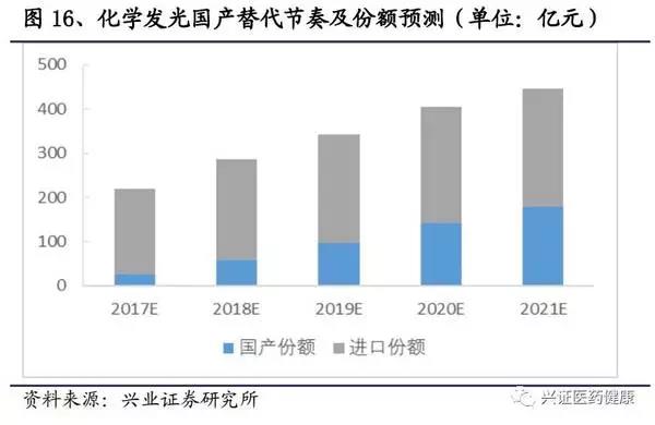目前,化學發(fā)光行業(yè)以25%-30%的增速增長,現(xiàn)國內(nèi)企業(yè)已突破技術壁壘,進入銷售放量階段,參考生化替代的節(jié)奏,5年內(nèi)可占有近一半的市場份額。預計在2021年,國內(nèi)廠家可總共占有百億以上的市場份額。