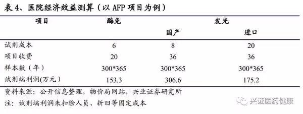 由于儀器是通過投放的形式進駐醫(yī)院,從醫(yī)院端只需要計算試劑成本。以上測算可得出,此醫(yī)院若用發(fā)光替代酶免不僅進行了檢驗技術升級,得到優(yōu)化的檢驗結果,在經(jīng)濟效益上也更優(yōu)。在發(fā)光項目上,國產(chǎn)對比進口經(jīng)濟效益明顯,單個項目可得到百來萬的額外收益。