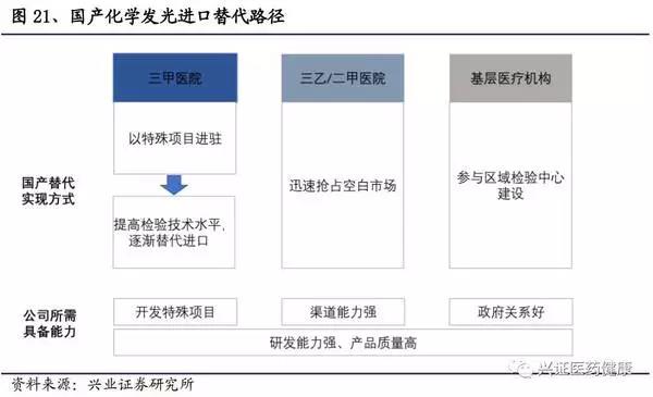 對于三甲醫(yī)院,其技術偏好較高,從目前的市場反應來看,國產(chǎn)發(fā)光儀器和試劑的精確性和穩(wěn)定程度仍不能達到三甲醫(yī)院的要求。同時三甲醫(yī)院多有聲譽追求,對進口品牌的忠誠度高。在價格上,樣本量大、檢驗結果質量要求高、檢驗人員成本高致使其相對價格不敏感。而國內(nèi)廠家對于試劑的研發(fā)仍停留在檢測項目的拓展上,基于現(xiàn)狀,大規(guī)模進口替代較難實現(xiàn)。有些特殊項目未涉及,如藥物濃度檢測等,可作為突破口進駐高端醫(yī)院,建立品牌形象??傮w來說,短期內(nèi)國內(nèi)廠商可依靠特殊項目檢查可獲得三級醫(yī)院小部分份額,長期來看,想進駐高端醫(yī)院并獲得主力項目的份額,須加大研發(fā)投入,做好做精發(fā)光試劑,打破醫(yī)院對于國產(chǎn)山寨的慣性認知。