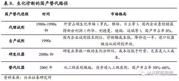 現(xiàn)今,化學發(fā)光的發(fā)展階段與2000年左右的生化市場相似,回顧生化市場的國產(chǎn)替代進程,可有一定的啟示作用。生化的發(fā)展首先從代理國外廠家的試劑開始,逐步自主研發(fā)試劑,此時促使國外廠家對其生化系統(tǒng)進行開放。而后逐步研發(fā)出生化儀器,對整個生化診斷進行替代。進程如下: