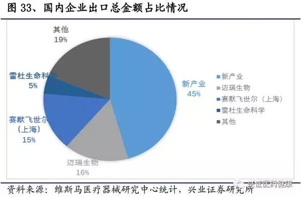 渠道能力強,國內(nèi)外銷售情況表現(xiàn)不俗。新產(chǎn)業(yè)采用經(jīng)銷為主,直銷為輔的模式進行銷售。在國內(nèi)市場,新產(chǎn)業(yè)終端用戶分布范圍廣,省份分散,覆蓋醫(yī)院3000多家。其中,二級醫(yī)院有1千多家,三級醫(yī)院近1千家,一級醫(yī)院較少。今后,一級醫(yī)院市場將被充分開發(fā),將通過自購或者區(qū)域檢驗中心的方式,將免疫檢測技術更新至化學發(fā)光法,市場空間巨大。在出口方面,儀器出口收入占到總收入近一半,試劑出口收入占到10%左右。2016年出口總額為國內(nèi)第一,占到總金額的45.6%。