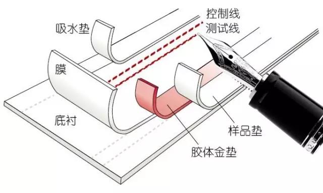 圖1所示的是膠體金免疫層析測(cè)試卡的結(jié)構(gòu),由樣品墊、膠體金結(jié)合墊、硝酸纖維素膜、吸水墊構(gòu)成。其中,膠體金顆粒上修飾有檢測(cè)抗體,硝酸纖維素膜上有檢測(cè)線和控制線。檢測(cè)時(shí),被測(cè)樣本在毛細(xì)作用下通過(guò)膠體金標(biāo)記的抗體,形成抗原抗體膠體金復(fù)合物,復(fù)合物繼續(xù)爬行,通過(guò)包被有捕捉抗體的檢測(cè)線,形成雙抗體夾心膠體金復(fù)合物,在檢測(cè)線處呈現(xiàn)色帶。過(guò)量的膠體金抗體流過(guò)檢測(cè)線,在之后的控制線上形成膠體金免疫復(fù)合物,呈現(xiàn)色帶。需要注意的是,控制線上色帶的形成與被檢測(cè)物質(zhì)的存在與否無(wú)關(guān),即使樣本里沒(méi)有被檢測(cè)的物質(zhì),控制線也會(huì)顯現(xiàn)。這種“捕捉抗體-抗原-檢測(cè)抗體-膠體金納米顆粒標(biāo)記物”復(fù)合結(jié)構(gòu)被稱為雙抗體夾心結(jié)構(gòu),膠體金為指示標(biāo)記。最典型的產(chǎn)品是“早早孕”試紙條,采用雙抗體夾心一步法技術(shù),以膠體金為指示標(biāo)記檢測(cè)尿液中的人絨毛膜促性腺激素(Human Choionic Gonadotophin,HCG)濃度,以判斷受檢者是否受孕。