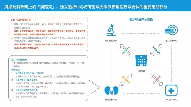 17年新政實施后,獨立血液透析中心將有望同第三方獨立檢驗中心、檢查中心一道,成為新型醫(yī)療聯(lián)合體的組成部分。