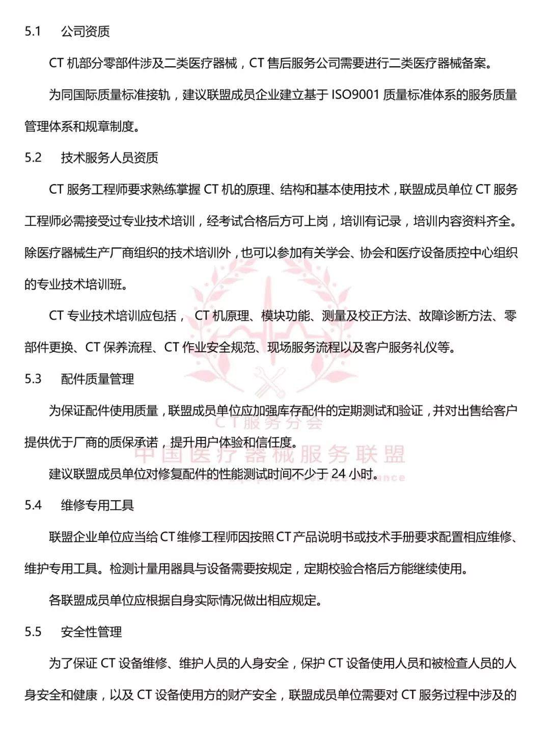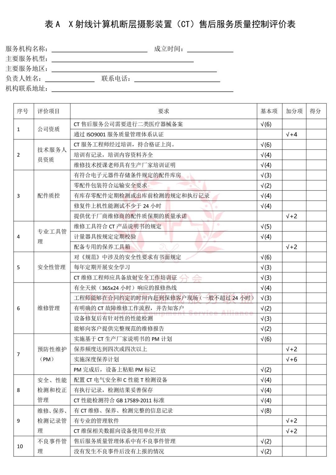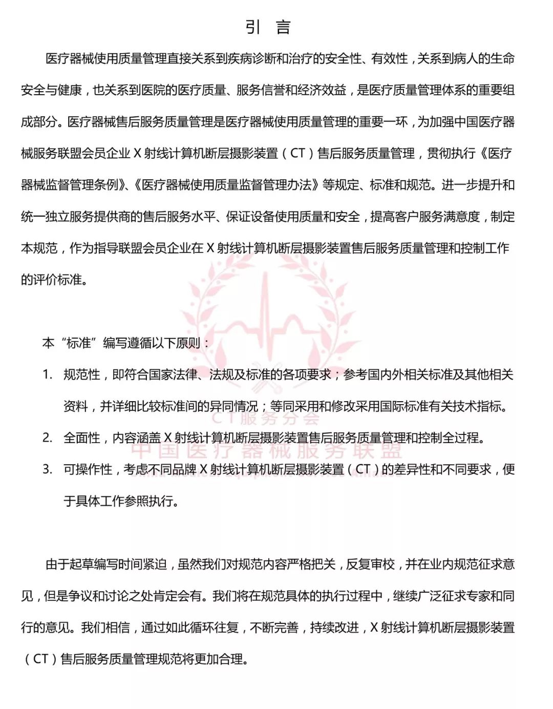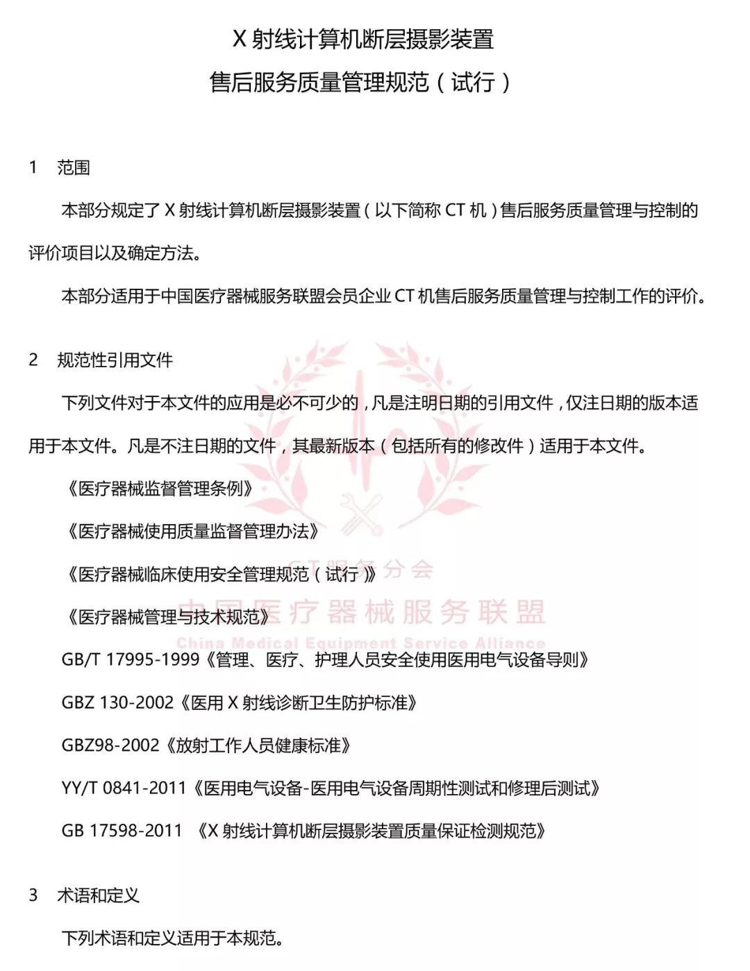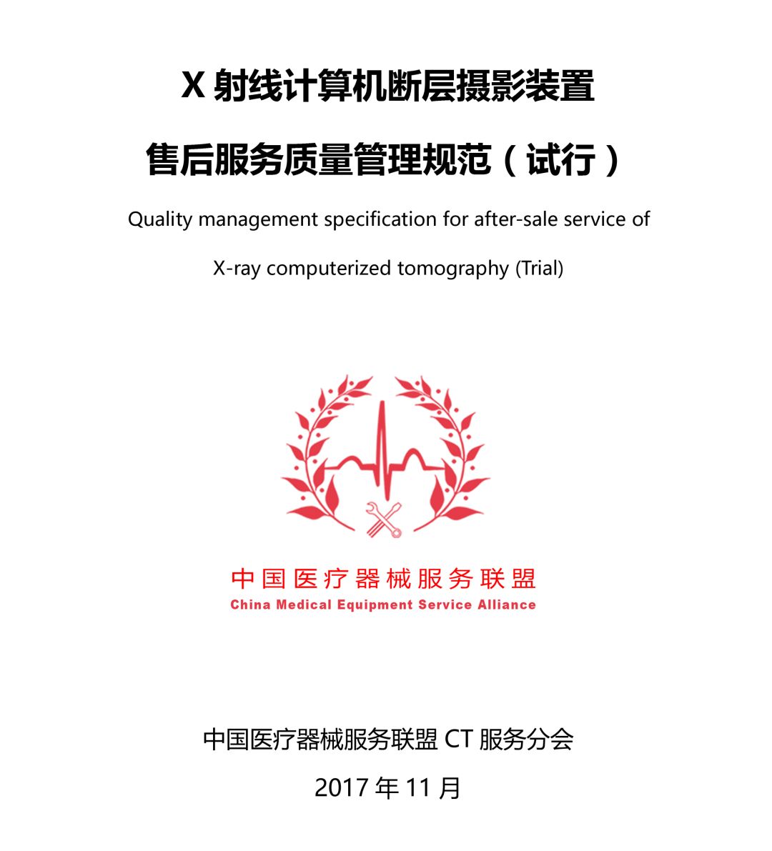 醫(yī)療器械售后服務質量管理是醫(yī)療器械使用質量管理的重要一環(huán),為加強e中國醫(yī)療器械服務聯盟會員企業(yè)X射線計算機斷層攝影裝置(CT)售后服務質量管理,貫徹執(zhí)行《醫(yī)療器械監(jiān)督管理條例》、《醫(yī)療器械使用質量監(jiān)督管理辦法》等規(guī)定、標準和規(guī)范,進一步提升和統一獨立服務提供商的售后服務水平、保證設備使用質量和安全,提高客戶服務滿意度,制定本規(guī)范,作為指導聯盟會員企業(yè)在X射線計算機斷層攝影裝置售后服務質量管理和控制工作的評價標準。