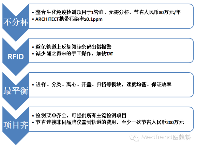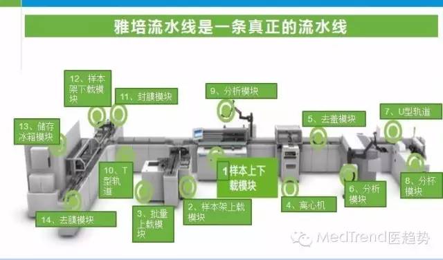 縱觀IVD國際品牌的發(fā)展歷程,都是從低速生化朝高速生化發(fā)展,由單機(jī)朝向集成化、自動(dòng)化、流水線的方向發(fā)展。由于中國病人的過度集中于大型三級醫(yī)院,年收入超過10億的醫(yī)院每天樣本量超過1000個(gè),高速儀器是高端醫(yī)院的剛需,因此研發(fā)高速儀器的能力也是未來進(jìn)入大型公立醫(yī)院的前提要求,流水線、生化免疫聯(lián)機(jī)是大勢所趨。